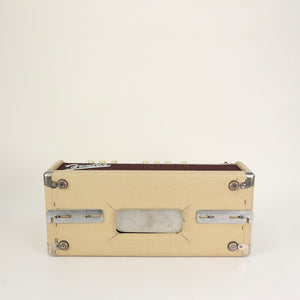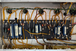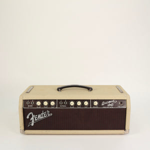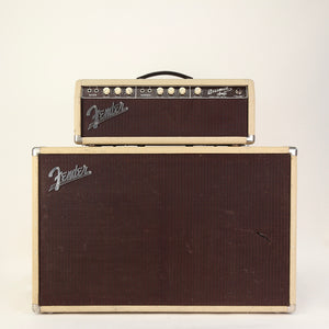 Leo Fender's Bassman piggy back amp, blonde tolex with oxblood grill cloth. Very hard to find in this condition with all matching code stamps. All original transformers in clean condition. Three prong cord added for safety. Original blue molded tone caps intact. Speaker cab shows wear including tolex rip on bottom. Speaker cab handle is a Fender replacement. Sound is big and bold like many pre-CBS amps of this era. This one looks great in the studio or living room, would make a great addition to anyone's collection.