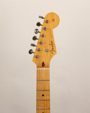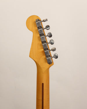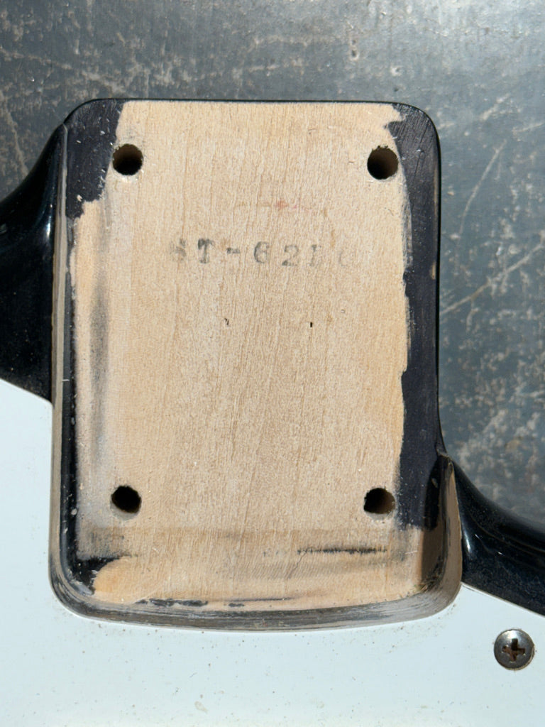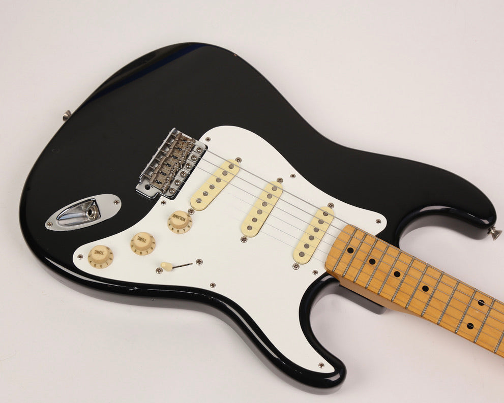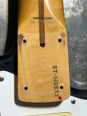 Japanese made 1954 Stratocaster reissue in original black finish with single ply white guard, maple neck. Serial number is V021438.