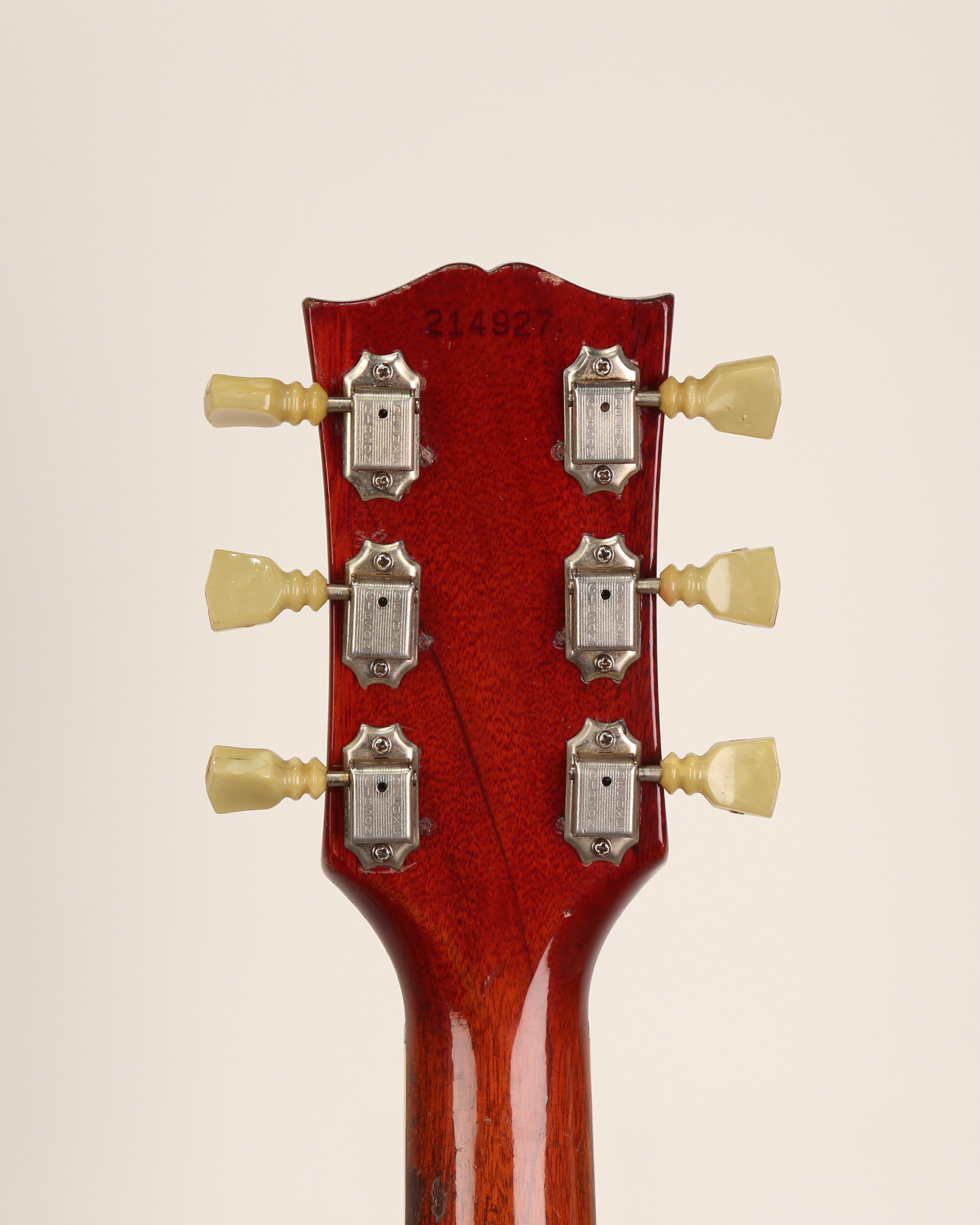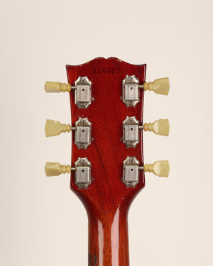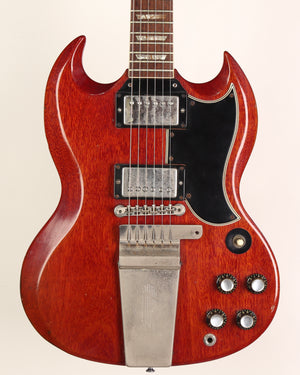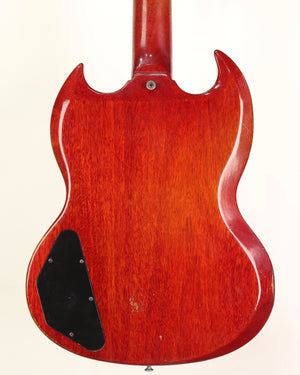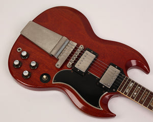 Gibson SG in original cherry finish, nickel hardware, desirable wide 'blade' nut as found on early 60s examples. The pickups and bridge have been changed long ago and perfectly match the nickel hardware patina. Schaller tuners replaced with appropriate 1960s Kluson tuners. No breaks or cracks. Pots date 1964.