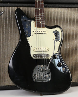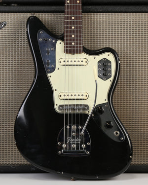 1962 Pre-CBS era Jaguar with a black refin, slab board rosewood neck. Original pickups are strong at N: 6.66k and B: 8.11k. Nut width is 1.52 inches. Weight is 8 lb 1oz. Pro refret and Mastery bridge makes this one the perfect player's Jaguar.